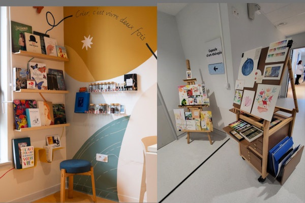 Le premier consiste en la création d’une salle dédiée à l’art‑thérapie, entièrement équipée pour proposer des expériences artistiques, sensorielles et méditatives : œuvres issues de grands musées, musique immersive, parfums, fauteuils relaxants, matériel de création, artothèque. Un chariot mobile permet également de poursuivre l’accompagnement au chevet des patients lorsque le déplacement n’est plus possible.